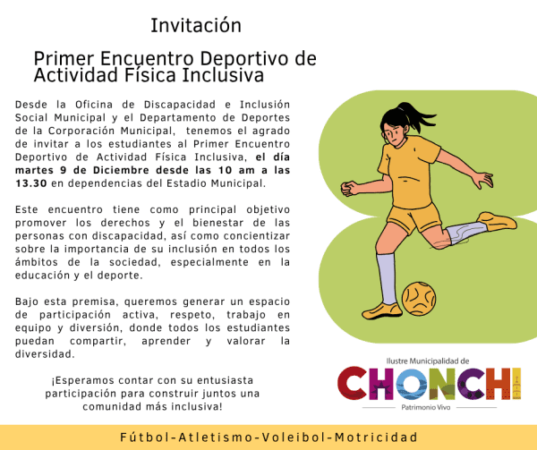 En Noticias 0 EL “PRIMER ENCUENTRO DEPORTIVO DE ACTIVIDAD FÍSICA INCLUSIVA” SE REALIZARÁ EN CHONCHI EN UN GRAN ESPACIO DE PARTICIPACIÓN ACTIVA.