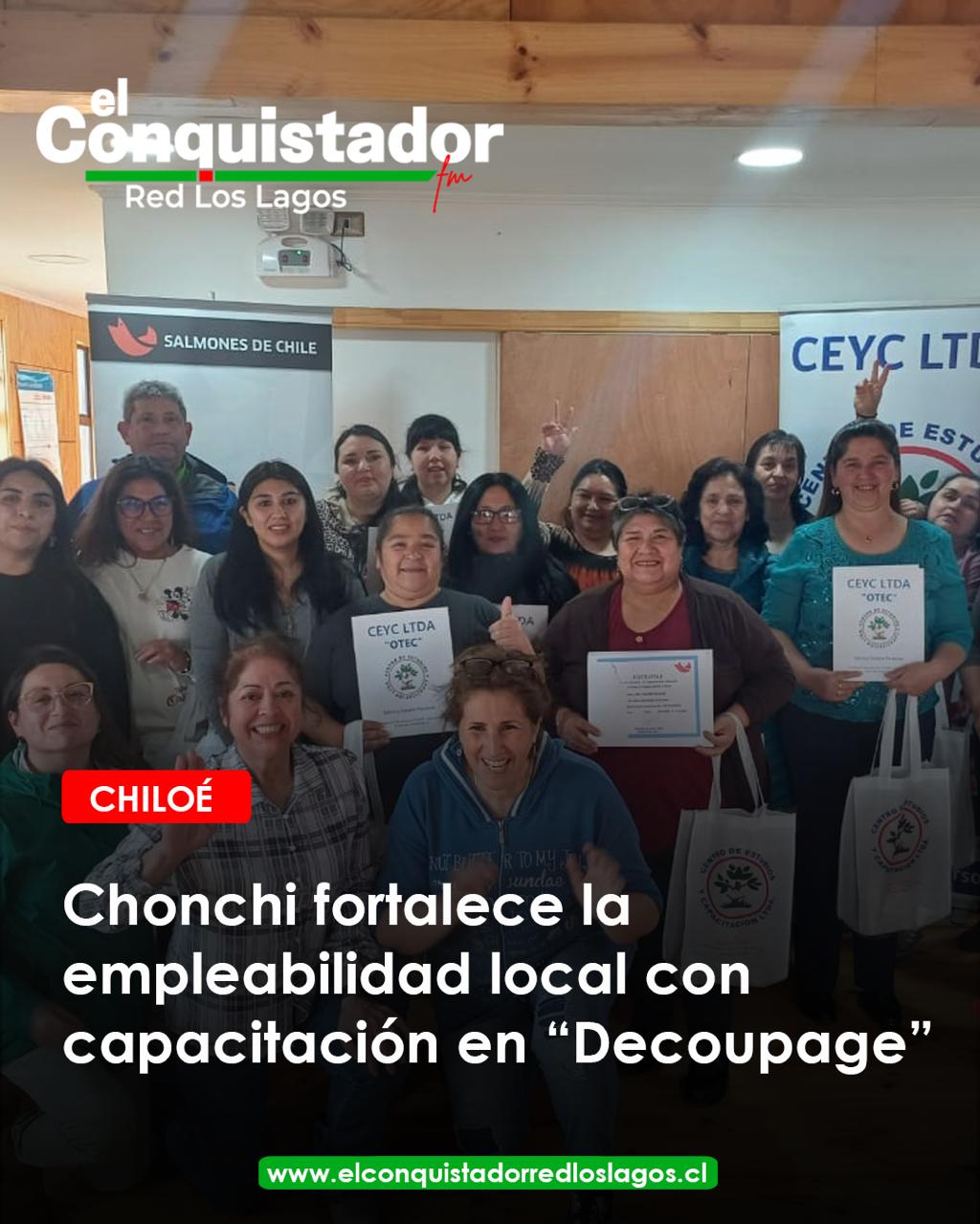 La Municipalidad de Chonchi, en colaboración con Salmones de Chile, culminó con éxito el curso “Técnica y Aplicaciones de Decoupage”, iniciativa gestionada por la OMIL que benefició a 16 mujeres de la comuna a través de la franquicia tributaria SENCE.