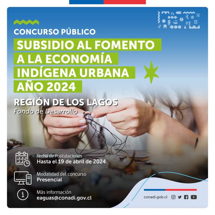 Convocatoria para la Región de Los Lagos, cuyo objetivo es potenciar y promover el fortalecimiento de emprendimientos y microempresas indígenas urbanas que rescaten, promuevan y/o desarrollen las culturas indígenas.