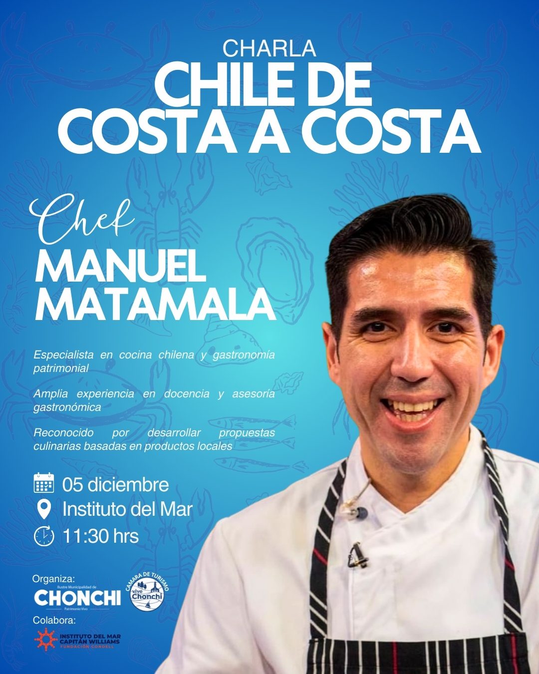 Damos la bienvenida al Chef Manuel Matamala a la experiencia “Sabores que Unen”, organizada por la Cámara de Turismo de Chonchi y la Ilustre Municipalidad de Chonchi y con la colaboración del Instituto del Mar Capitán Williams de Chonchi.