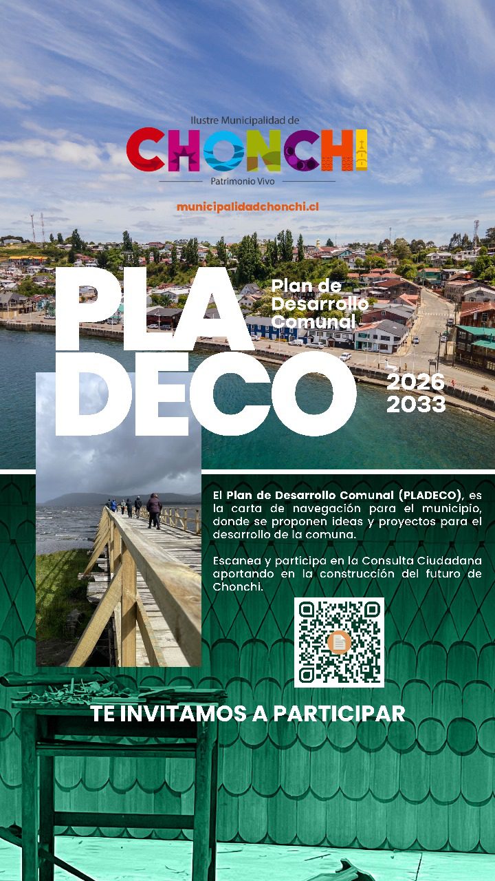 agosto 25, 2025 - En Noticias Por Emilio Soto Andrade 0 Fernando Oyarzún Macías, Alcalde de Chonchi y el Honorable Concejo Municipal, invitan a participar en el nuevo Plan de Desarrollo Comunal, PLADECO, importante instrumento de desarrollo de nuestra comuna para el periodo 2026-2033 CUESTIONARIO DE PARTICIPACIÓN CIUDADANA Anterior 4° Encuentro de Artesanos de la Zona Sur de Chiloé Siguiente USUARIAS DEL PROGRAMA “MUJERES JEFAS DE HOGAR” DE CHONCHI PARTICIPAN DE DIVERSAS CHARLAS CON DIFERENTES SERVICIOS PÚBLICOS Y OFICINAS MUNICIPALES.