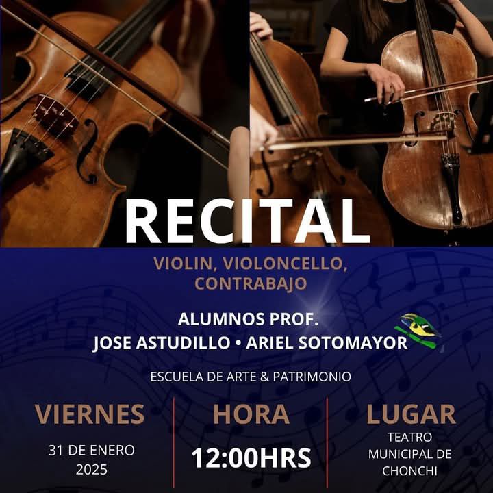 La Escuela de Arte y Patrimonio, invita a toda la comunidad a disfrutar de un precioso recital a cargo de José Astudillo y Ariel Sotomayor, este viernes 31 de enero, 12:00 horas, en el Teatro Municipal de Chonchi.