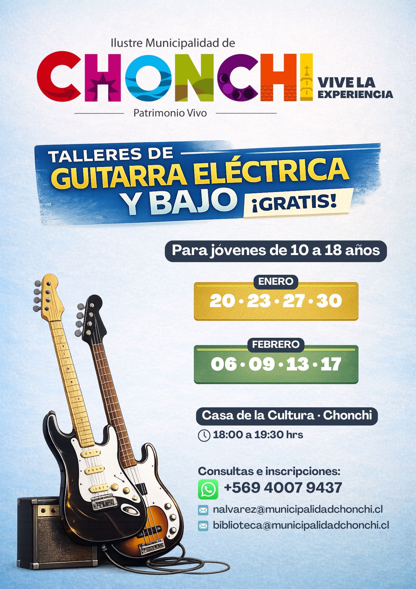 La Municipalidad de Chonchi, a través de su Departamento de Cultura, invita a inscribirte de manera gratuita en los talleres de “Guitarra Eléctrica y Bajo”, dirigidos a jóvenes de 10 a 18 años de edad. ¡Te esperamos!