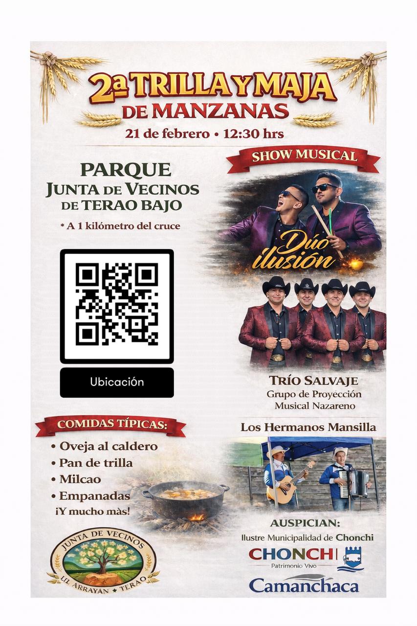 Alejandra Andrade, presidenta de la junta de vecinos “El Arrayan” de Terao Bajo, invitó a la comunidad local y visitantes a participar de esta actividad. “Estaremos desde las 12 y media del día ya con la primera trilla, después vamos a hacer un rato maja de manzana, vamos a ir alternando para que todos tengan la posibilidad de ver esta actividad junto a artistas invitados para hacer una fiesta de campo como se hacía antiguamente”.