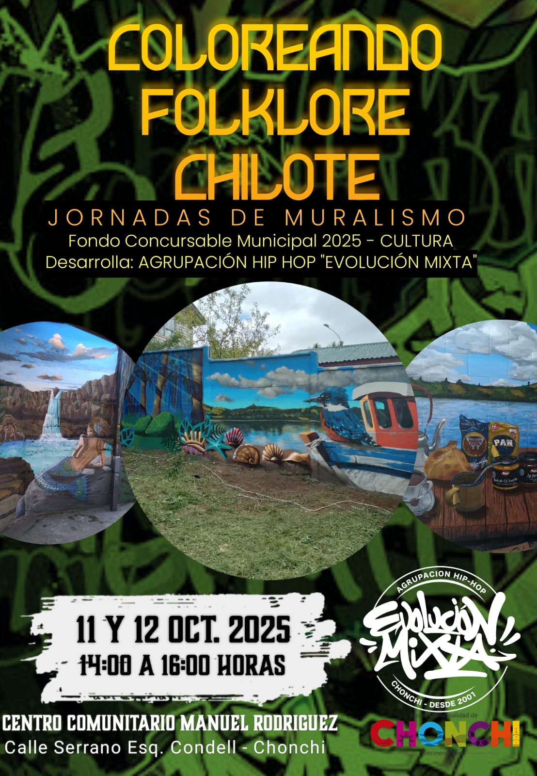 La Agrupación “Evolución Mixta” de nuestra comuna, invita a dos jornadas de arte y muralismo, este 11 y 12 de octubre en el Centro Comunitario, Manuel Rodríguez, a través de un proyecto financiado con el Fondo Concursable Municipal 2025, área Cultura de 14:00 a 16:00 horas.