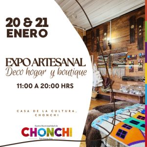En tanto, la Municipalidad de Chonchia invita a visitar la “Expo Artesanal”, que se realizará los días sábado 20 y domingo 21 de enero, desde las 11:00 a 20:00 horas en la Casa de la Cultura (Extensión Sargento Candelaria).