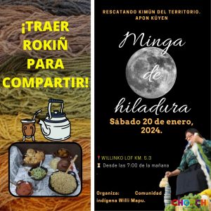 Recatando Kimun del Territorio Apon Kuyen, una minga de Hiladura se encuentra organizando la Comunidad Indígena Willi Mapu para este sábado 20 de enero, en el kilómetro 5,3 camino a Huillinco.