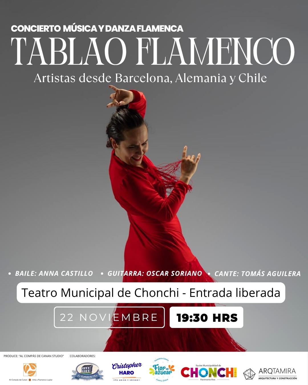 La Municipalidad de Chonchi, a través de su departamento de Cultura, invita a un Concierto de Música y Danza Flamenca, “Tablao Flamenco”, con artistas desde Barcelona, Alemania y Chile.