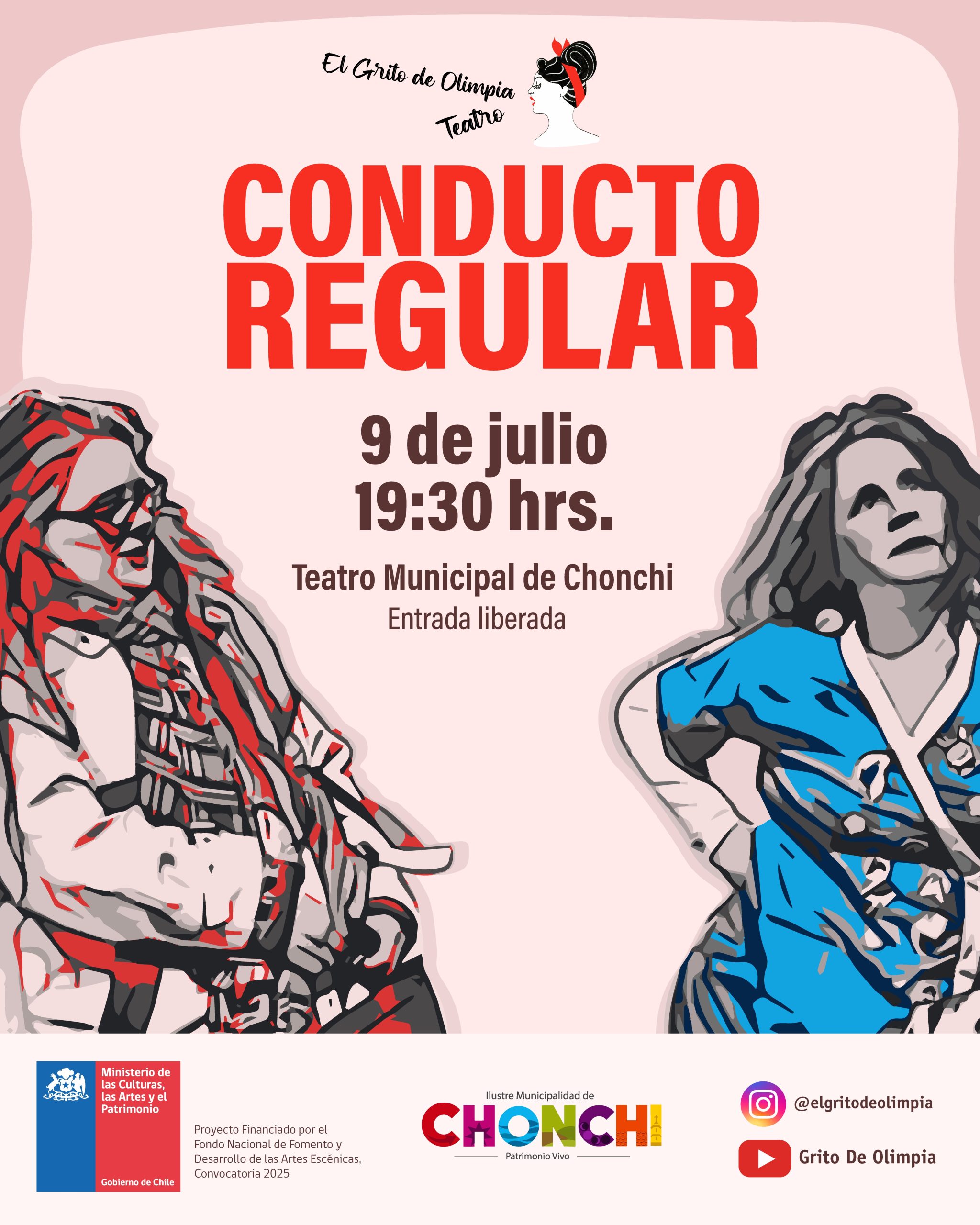 En el marco de las actividades de estas vacaciones de invierno organizads por el municipio de Chonchi, a través de su departamento de Cultura, invita para este miércoles 9 de julio a presenciar la obra de Teatro “Conducto Regular” de la compañía “El Grito de Olimpia” de la ciudad de Santiago, con entrada gratuita.