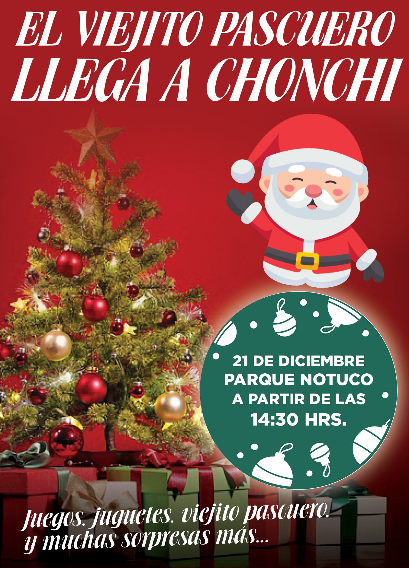 Fernando Oyarzún Macías, Alcalde de Chonchi y el Honorable Concejo Municipal, invitan a todos los niños de nuestra comuna y sus familias a celebrar la llegada de la Navidad, con un gran evento comunal que se realizará el domingo 21 de diciembre, desde las 14:30 horas, en el Parque Municipal de Notuco, donde habrá un gran show infantil, juegos, música, colaciones y los regalos que serán entregados por el propio Viejito Pascuero, en una hermosa tarde familiar. ¡No falten!