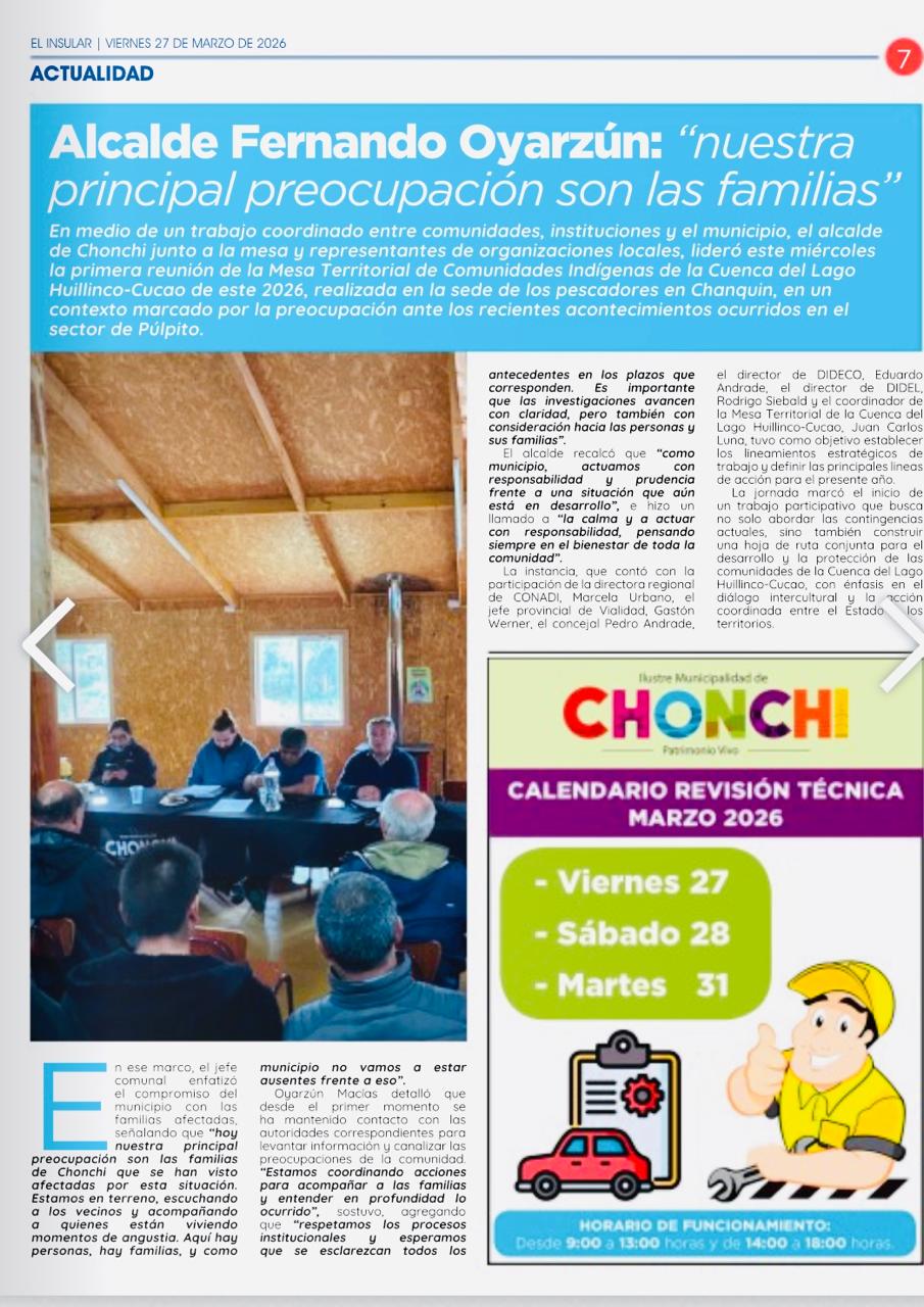 marzo 27, 2026 Por Emilio Soto Andrade Comment off Alcalde Fernando Oyarzún «Nuestra principal preocupación son las familias» Anterior Destacan fortalecimiento del deporte en Chonchi Siguiente Realizarán la conservación de caminos rurales y la reposición de dos ambulancias en Chonchi