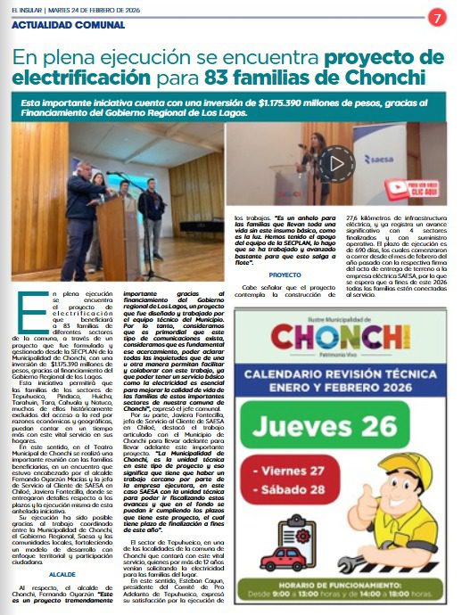 febrero 25, 2026 Por Emilio Soto Andrade Comment off En plena ejecución se encuentra proyecto de electrificación para 83 familias de Chonchi Anterior «Fiesta Criolla 2026»: Municipio reconoció a emprendedores Siguiente Chonchi y un verano lleno de visitantes