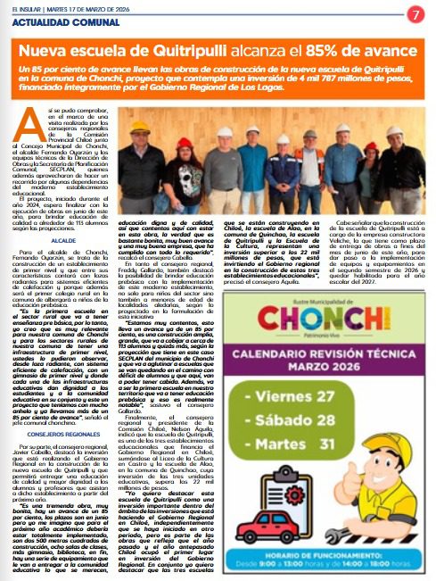 marzo 17, 2026 Por Emilio Soto Andrade Comment off Nueva escuela de Quitripulli alcanza el 85% de avance Anterior El verano no termina en Chonchi Siguiente Hasta el 31 de marzo se puede postular a los «Fondos Concursables Municipales de Chonchi 2026»